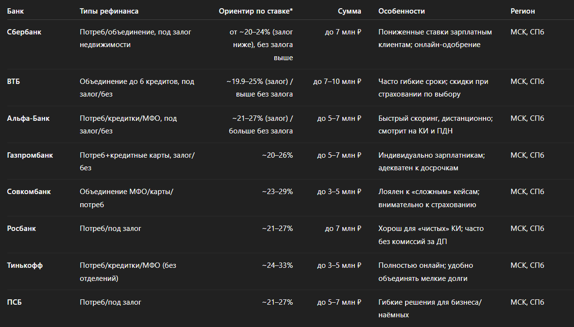 Рефинансирование — это замена старых кредитов новым на более выгодных условиях: ниже ставка, один платёж вместо нескольких, удобный срок. В Москве и Санкт-Петербурге выбор банков большой, но предложения отличаются по ставке, требованиям к заемщику и Полной Стоимости Кредита (ПСК). Ниже — практичное сравнение и чек-лист, чтобы не переплатить.